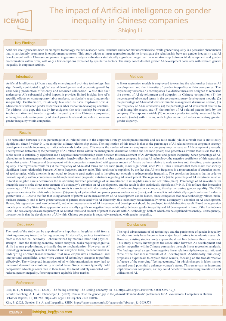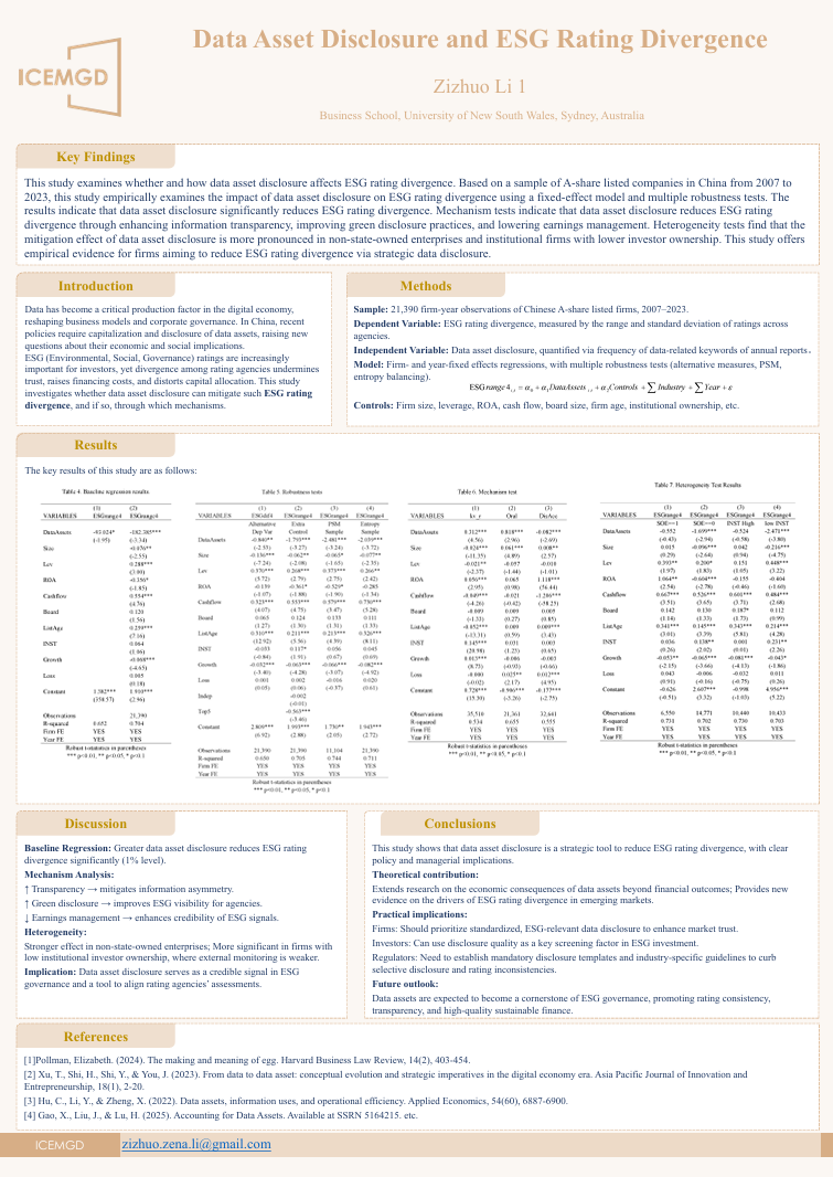 The online session of the ICEMGD 2025 will be held on September 26, 2025. We invited authors of qualified papers to deliver poster presentations. Here are some posters presented during the poster session: